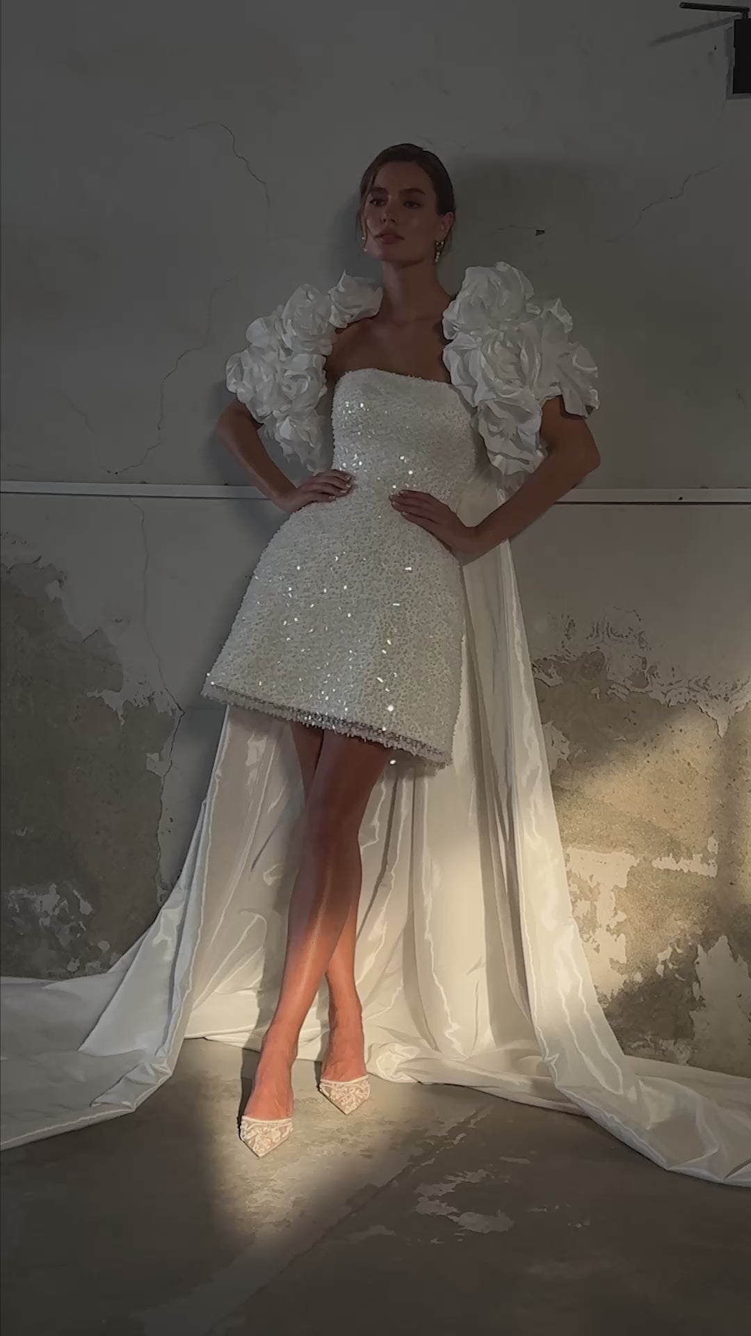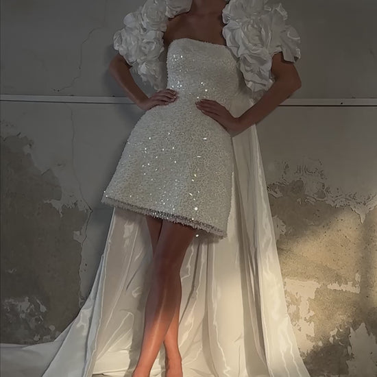 From the SKY Collection, this short beaded bridal gown blurs the line between couture art and modern celebration. The structured mini silhouette shimmers with hand-applied sequins and pearls, paired with a sculptural bolero of oversized floral appliqués that bloom like clouds. A detachable taffeta train flows from the back, giving the bride the power to transform from ceremonial grandeur to reception freedom. Designed for the fearless, the feminine, and the unforgettable — this is bridal rebellion in motion.