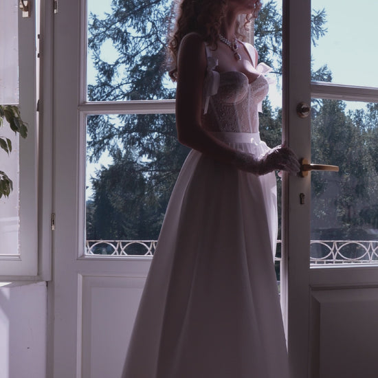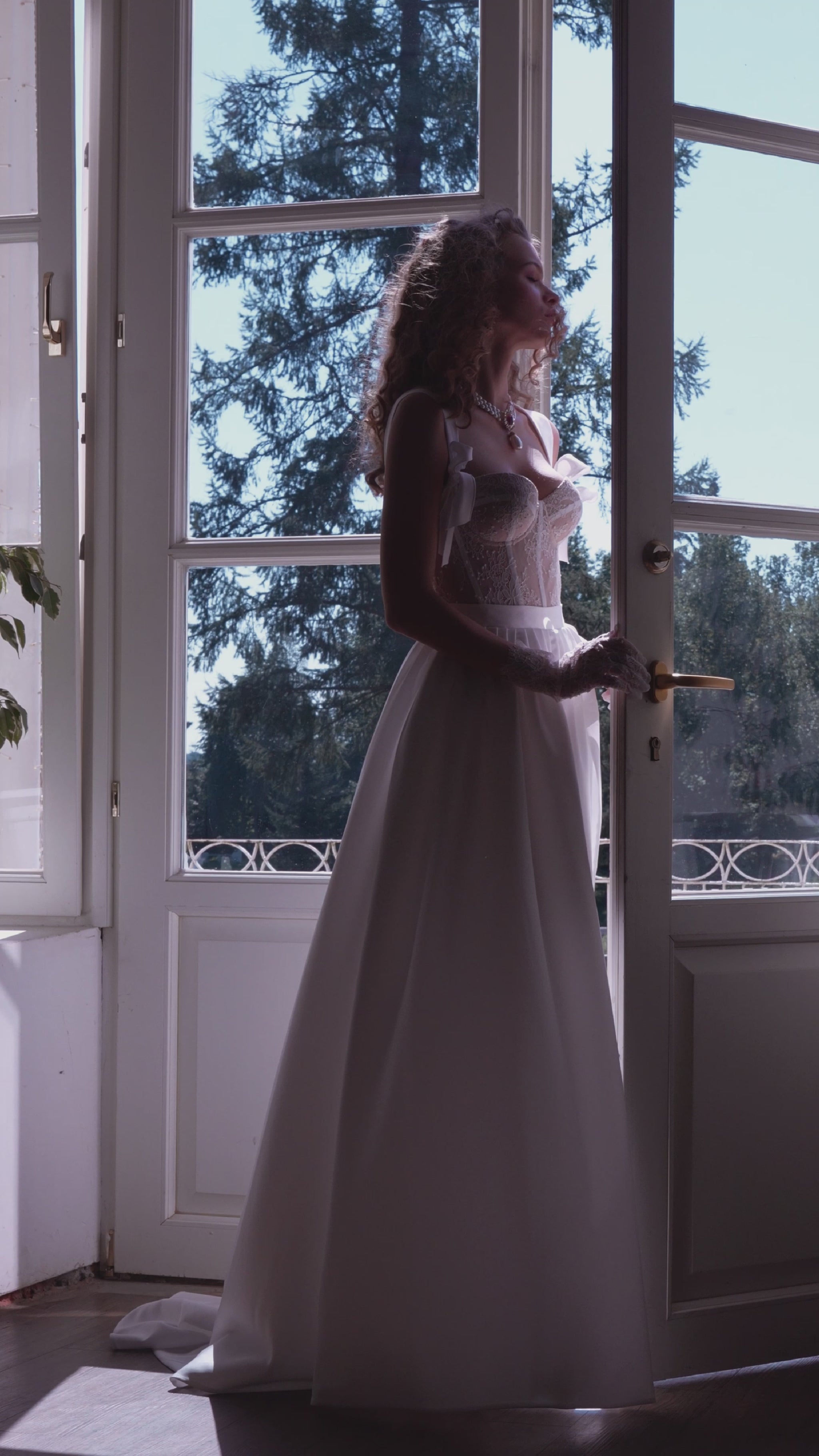 A masterpiece of romantic couture, this gown weaves together the delicacy of lace and the luminous flow of satin. Its sheer corset bodice, delicately boned and embroidered, sculpts the figure while exuding soft femininity. The shoulder bows add a touch of vintage sweetness — a nod to timeless bridal grace.