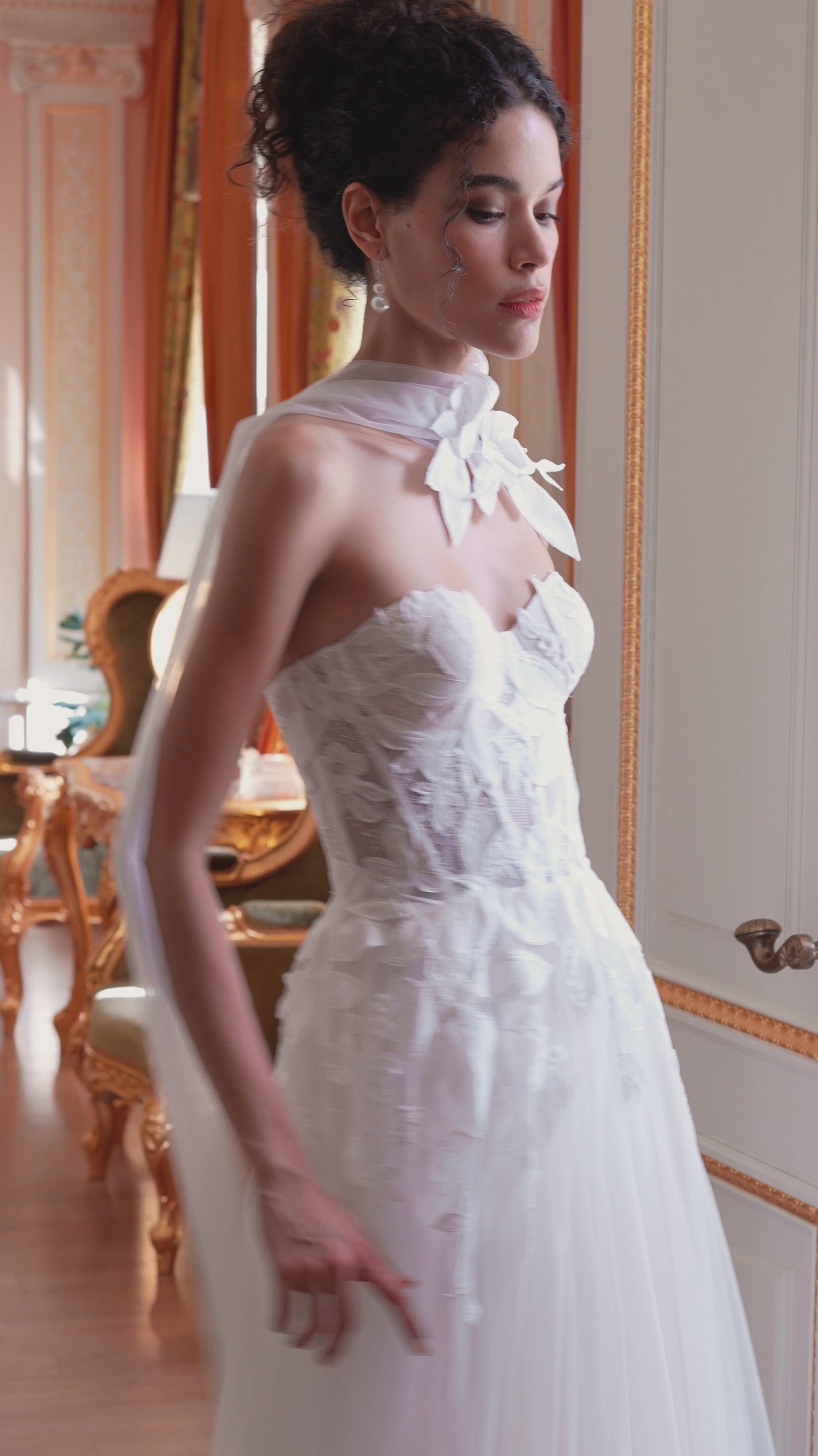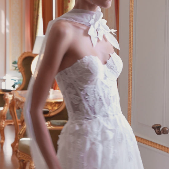 A draped neck-tie detail, adorned with a dimensional floral accent, frames the shoulders with delicate drama. Semi-sheer lace panels contour the waist, creating a light, romantic contrast against the full, whisper-soft skirt. The trailing hem releases into a fluid train that glides behind, adding a serene sense of movement to every step.
