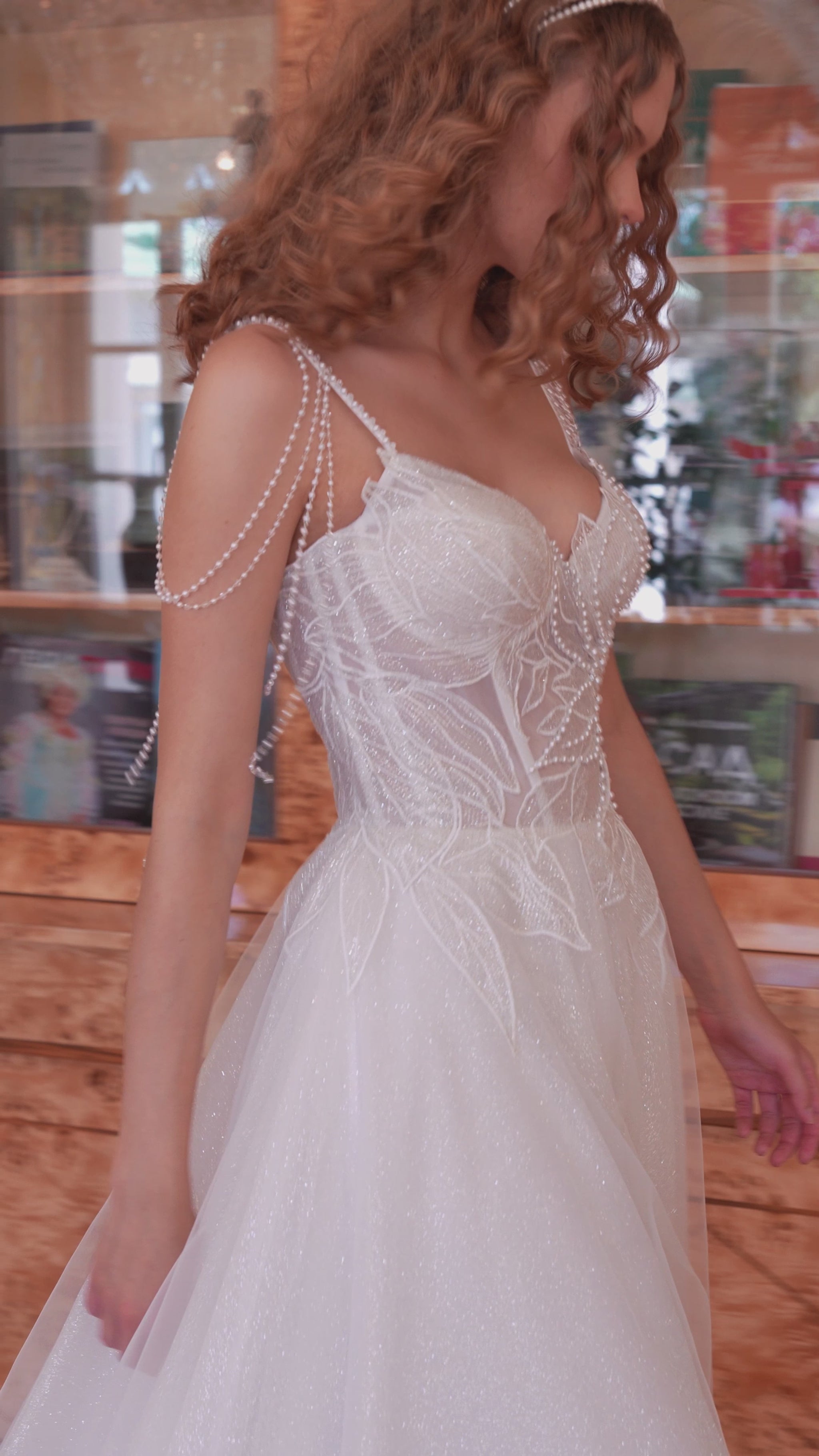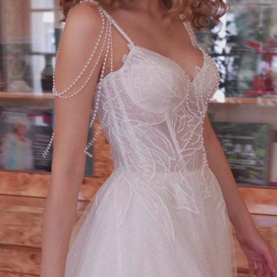 Glitter Tulle A-Line Wedding Dress with Beaded Corset and Pearl Straps
