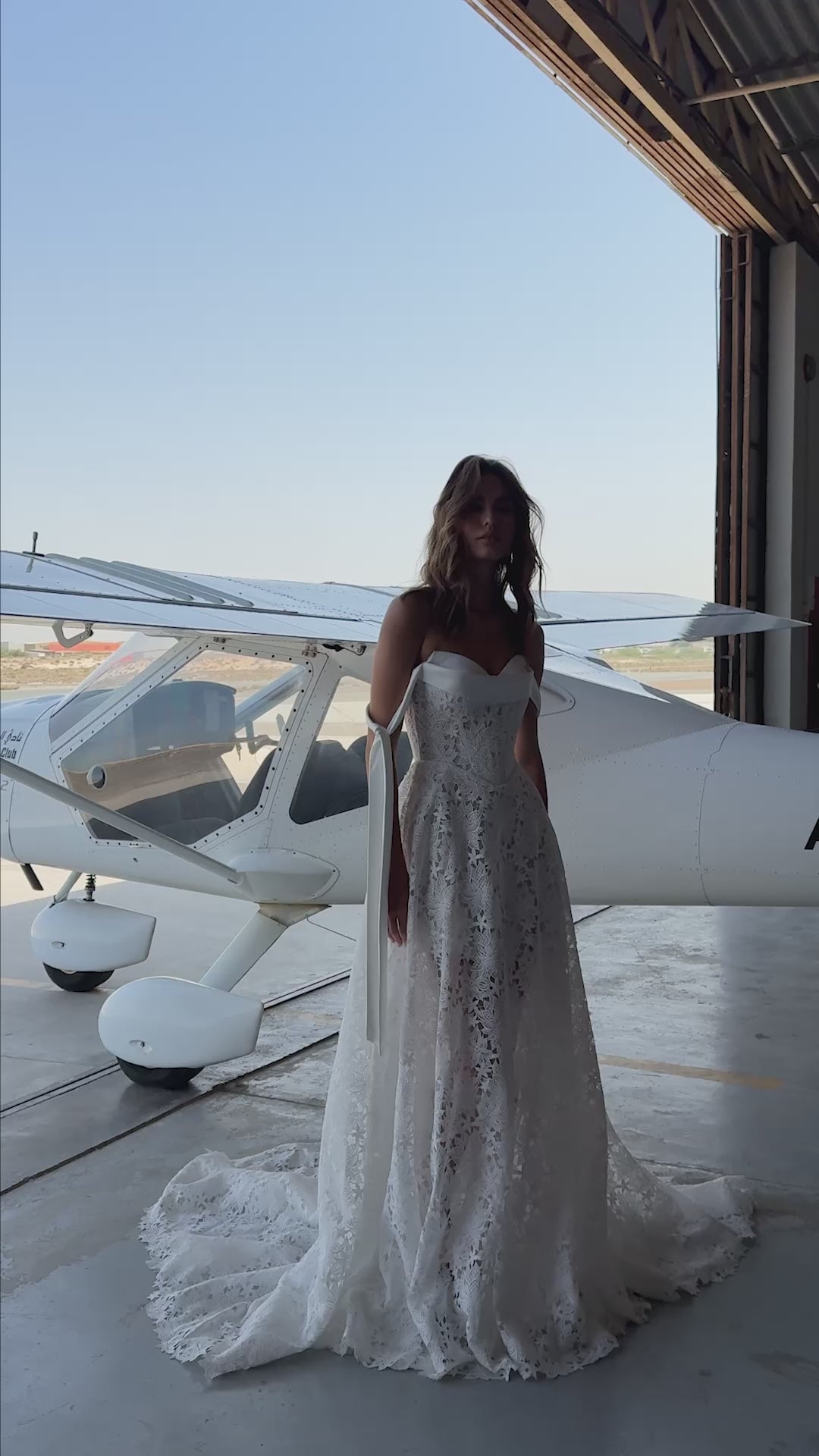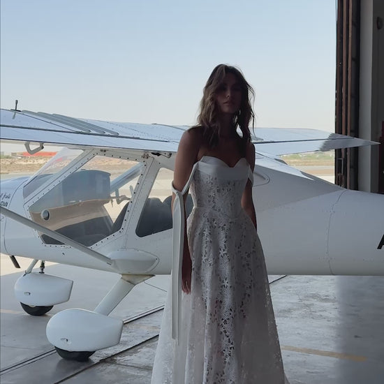 A modern symphony of contrast and craft — this A-line lace bridal gown redefines elegance through texture and silhouette. The sculpted sweetheart corset bodice meets a removable structured satin bolero with dramatic long sleeves and bold shoulders, framing the neckline with architectural grace. Beneath, layers of intricate floral lace cascade into a sweeping train, capturing movement and light. A design for the bride who commands presence — refined yet untamed, classic yet avant-garde.