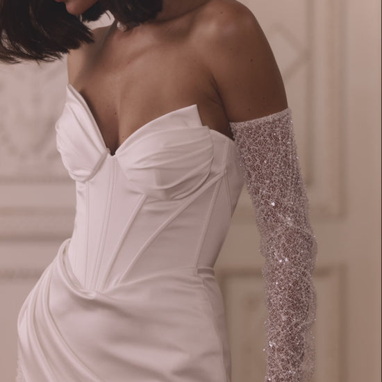 Not your average aisle moment. This modern wedding dress is made for the bride who edits tradition and owns every scene. Featuring a sculpting lace-up corset that cinches like a dream, detachable sleeves for that ceremony-to-reception transformation, and a sweeping train that’s basically made for slow-motion entrances.
