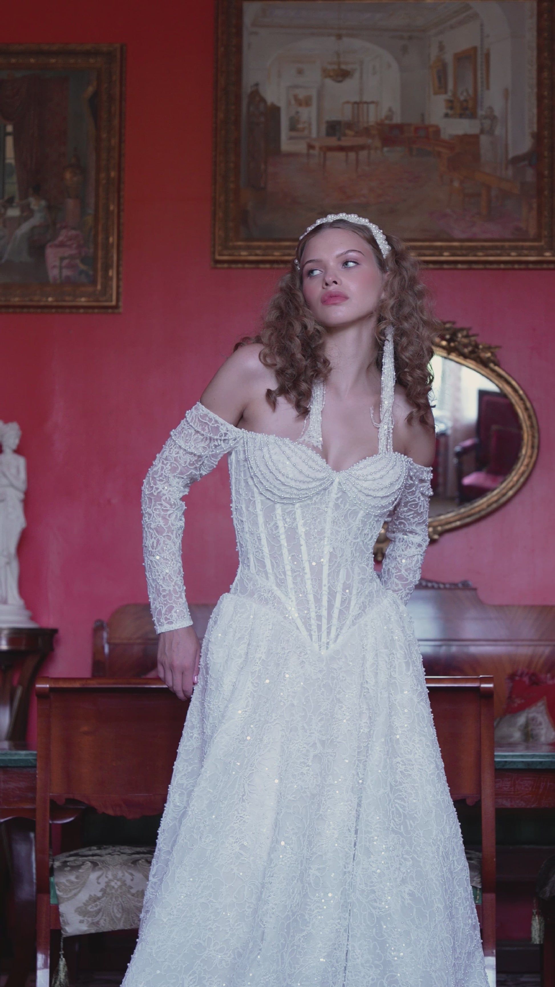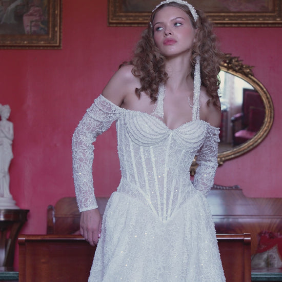 Drenched in light and romance, this off-the-shoulder ball gown pairs an artfully boned corset bodice with a full, shimmering skirt that moves like a halo. Thousands of hand-placed beads and sequins skim floral lace, catching every whisper of light, while detachable glove-style sleeves add poetic drama.