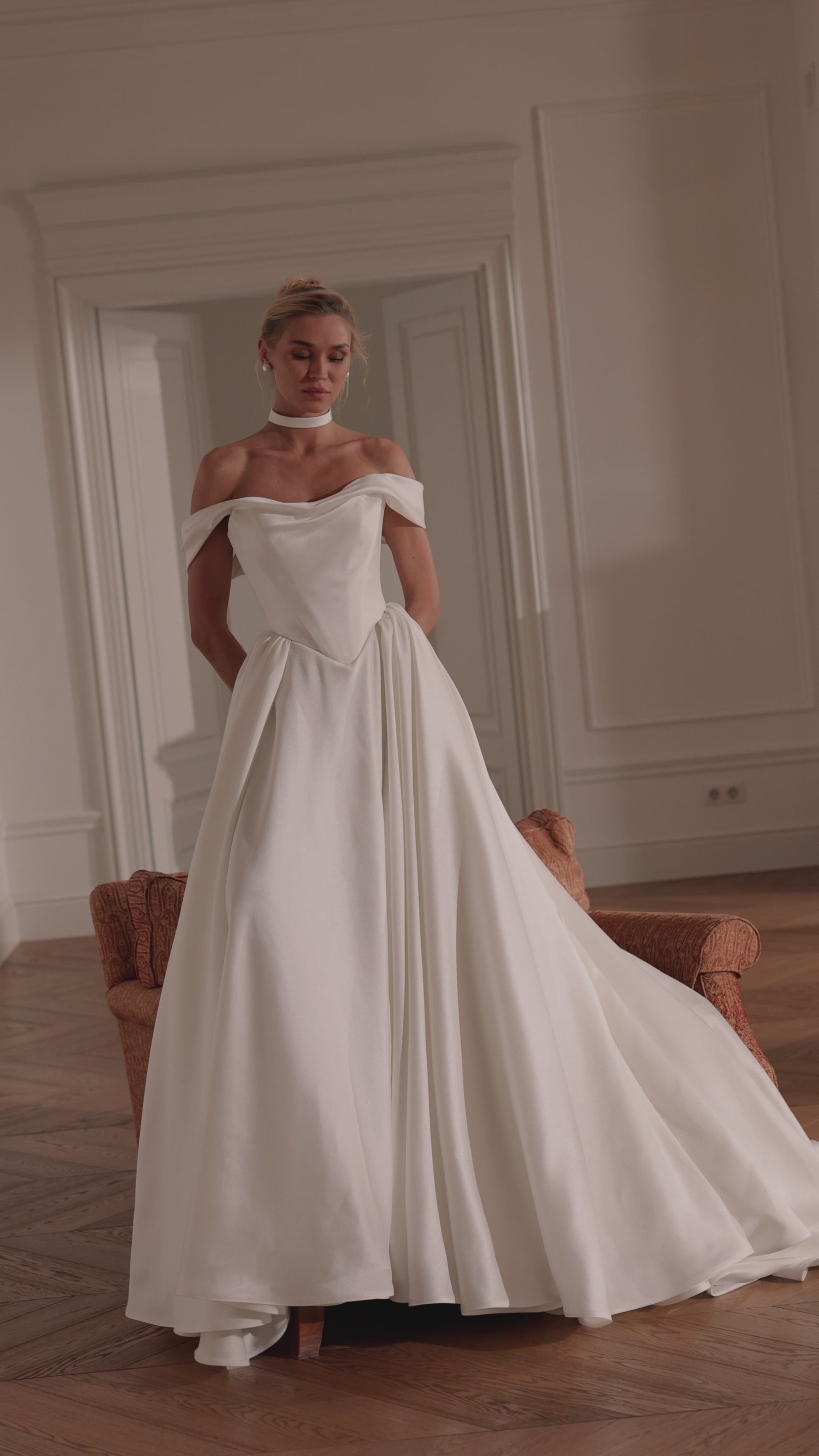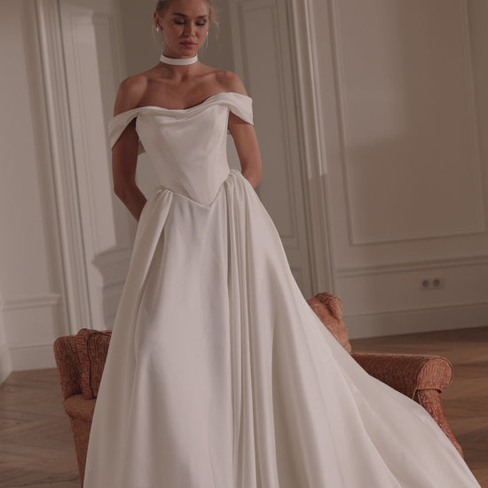 This timeless off-shoulder A-line gown, crafted in luxurious mikado, captures modern sophistication through its clean architectural lines. The structured bodice with a gently folded neckline creates an elegant frame around the shoulders, while the corset back sculpts a perfect hourglass silhouette.