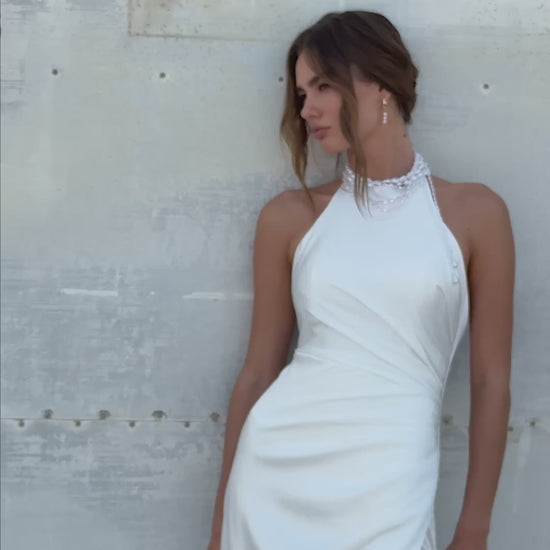 Neckline: Halter with pearl choker detail