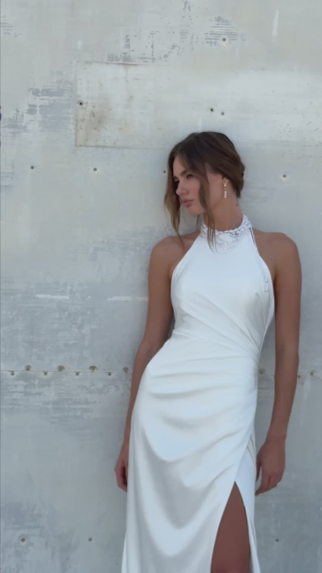 From the SKY Collection, this sleek satin halter gown redefines minimal bridal glamour. The clean lines of the fitted silhouette flow effortlessly into a draped hip and soft sweep train, while the open back creates a sculptural contrast of purity and sensuality. The high side slit adds movement and allure, designed for brides who want elegance with an edge. Perfect for modern ceremonies, city elopements, or destination celebrations — light as air, striking as flight.
