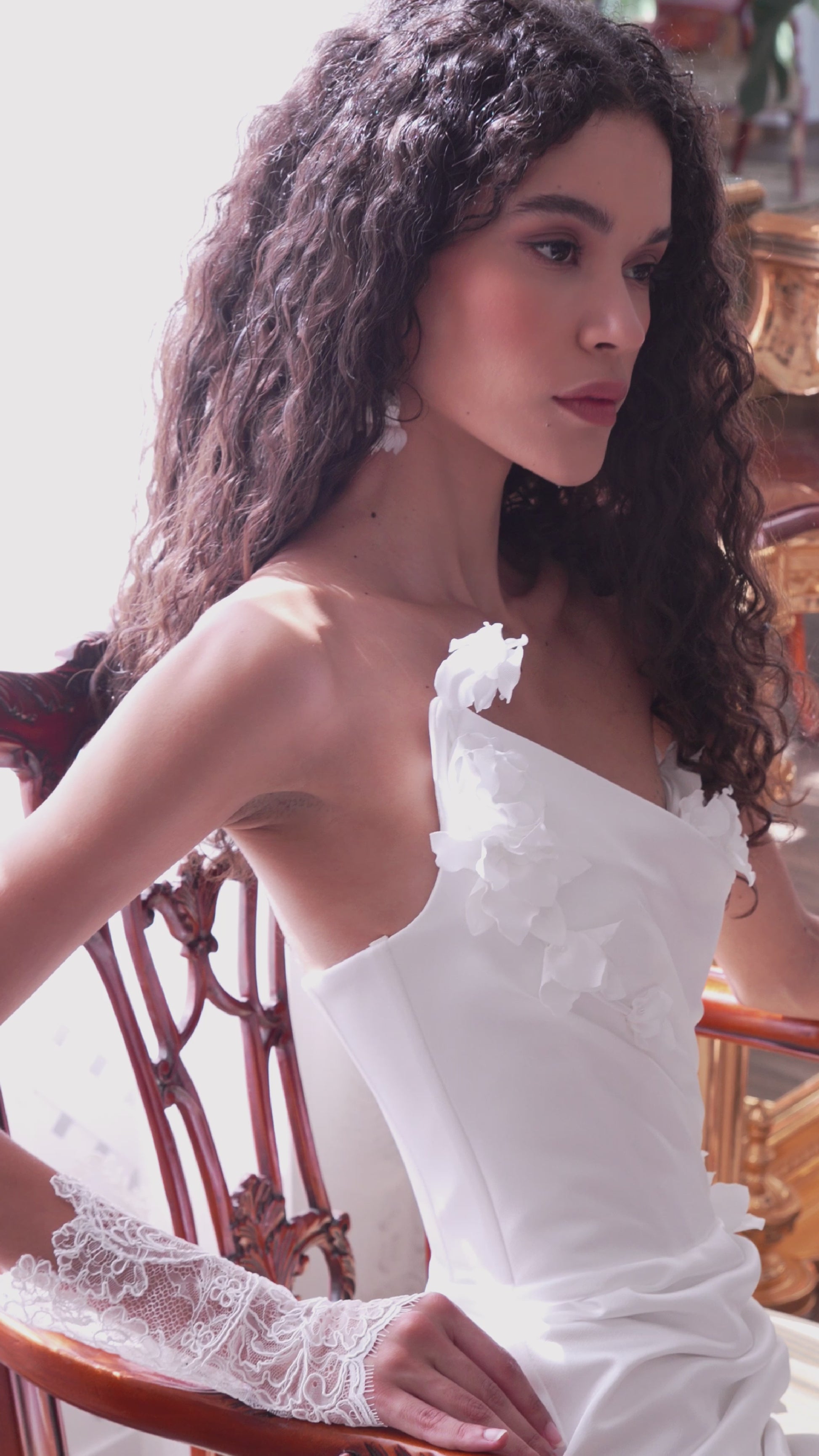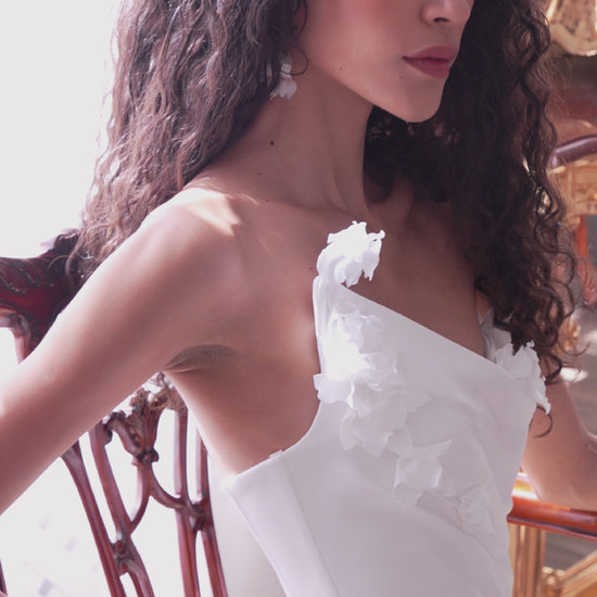 - Asymmetric neckline with hand-placed 3D floral appliqués