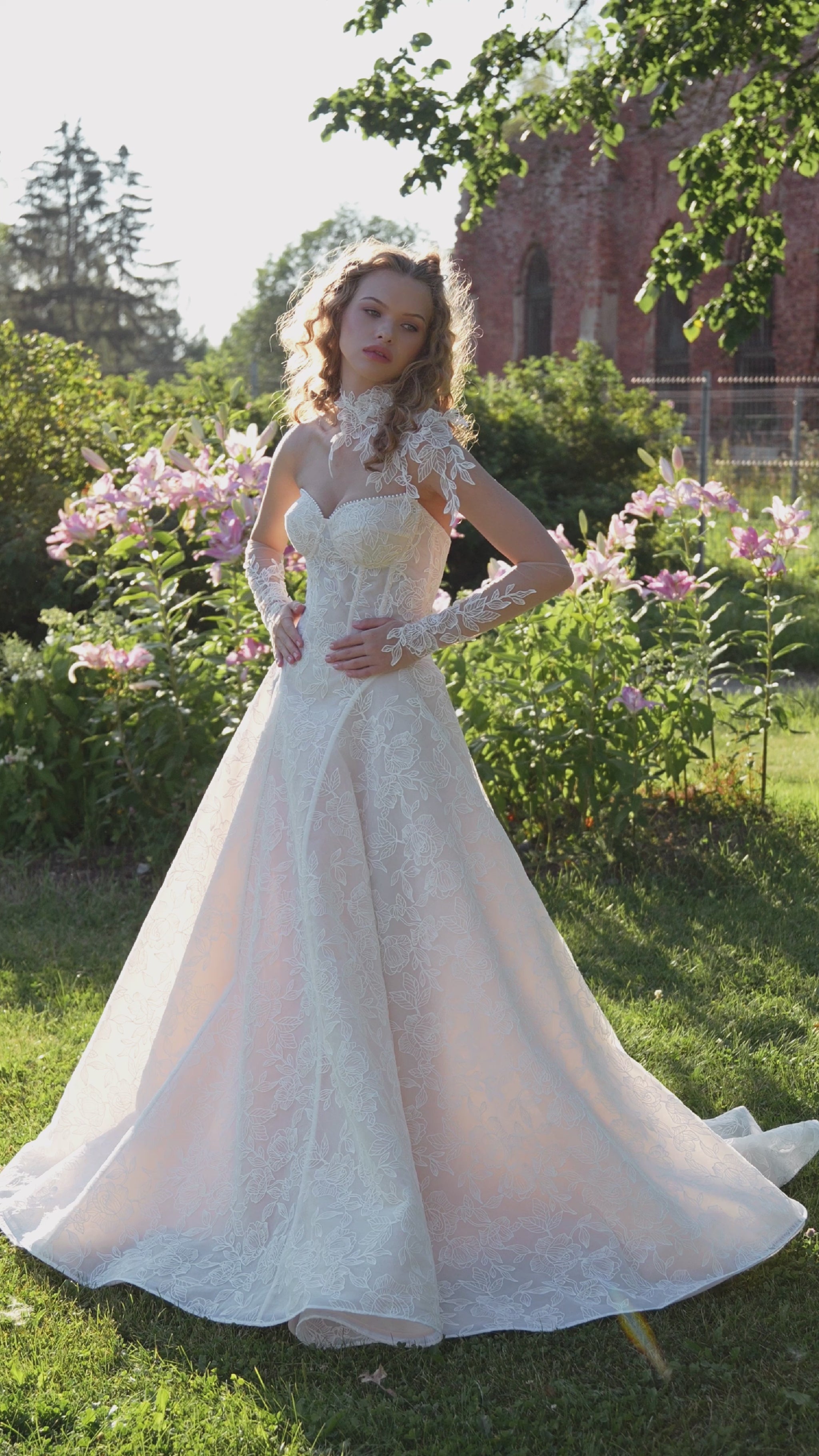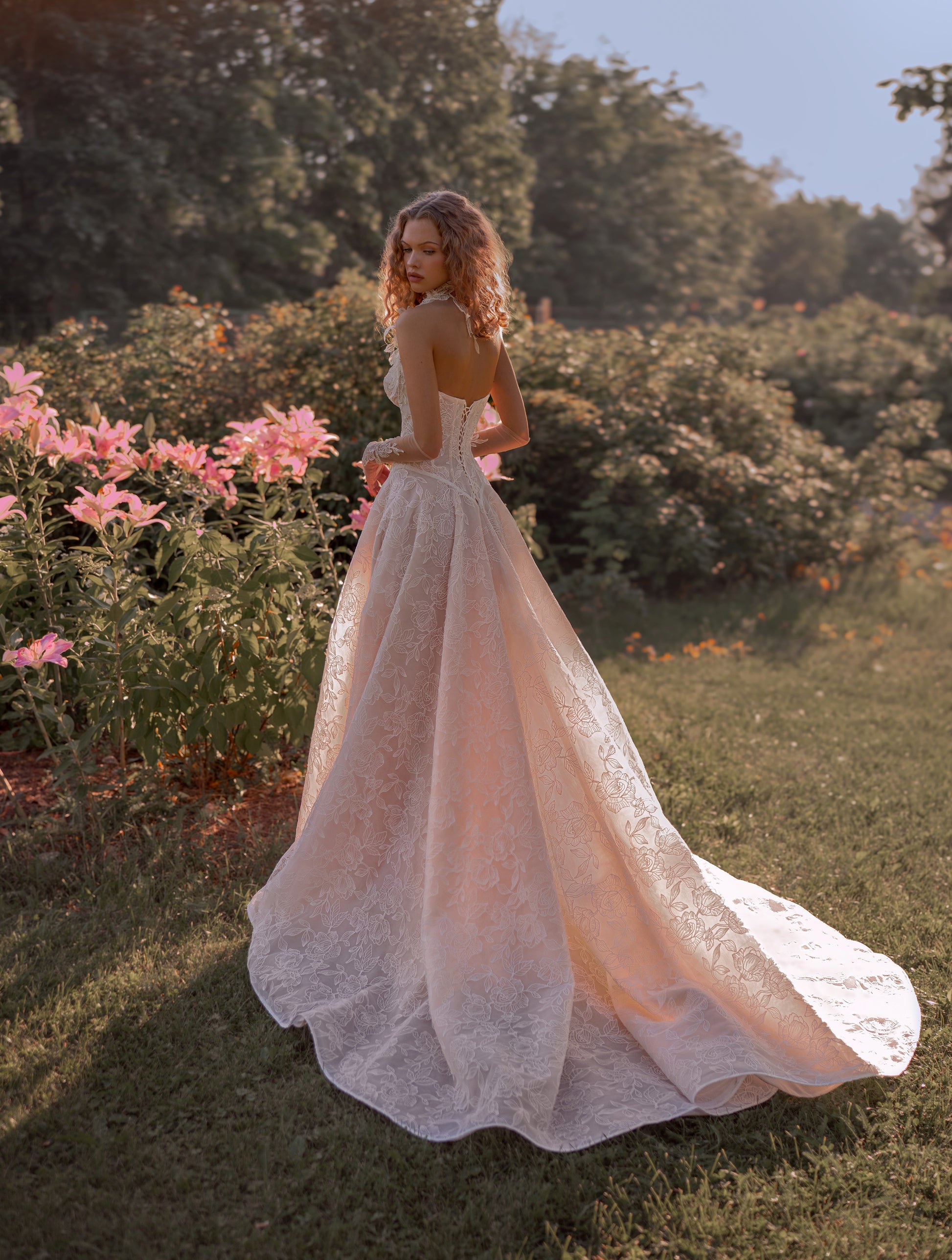 The skirt flows into a magnificent full silhouette, crafted from layers of delicate embroidered lace that capture the glow of every movement. A graceful combination of strength and softness, this gown celebrates classic elegance reimagined for the modern muse.