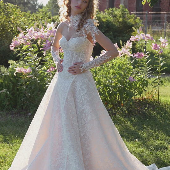Bathed in golden light, this gown evokes the romance of a timeless fairytale. The sculpted corset bodice, adorned with intricate floral lace, defines the waist and accentuates the feminine form with soft boning and refined structure.