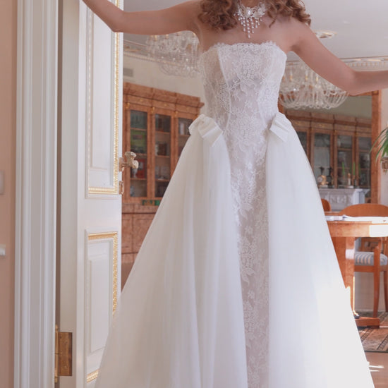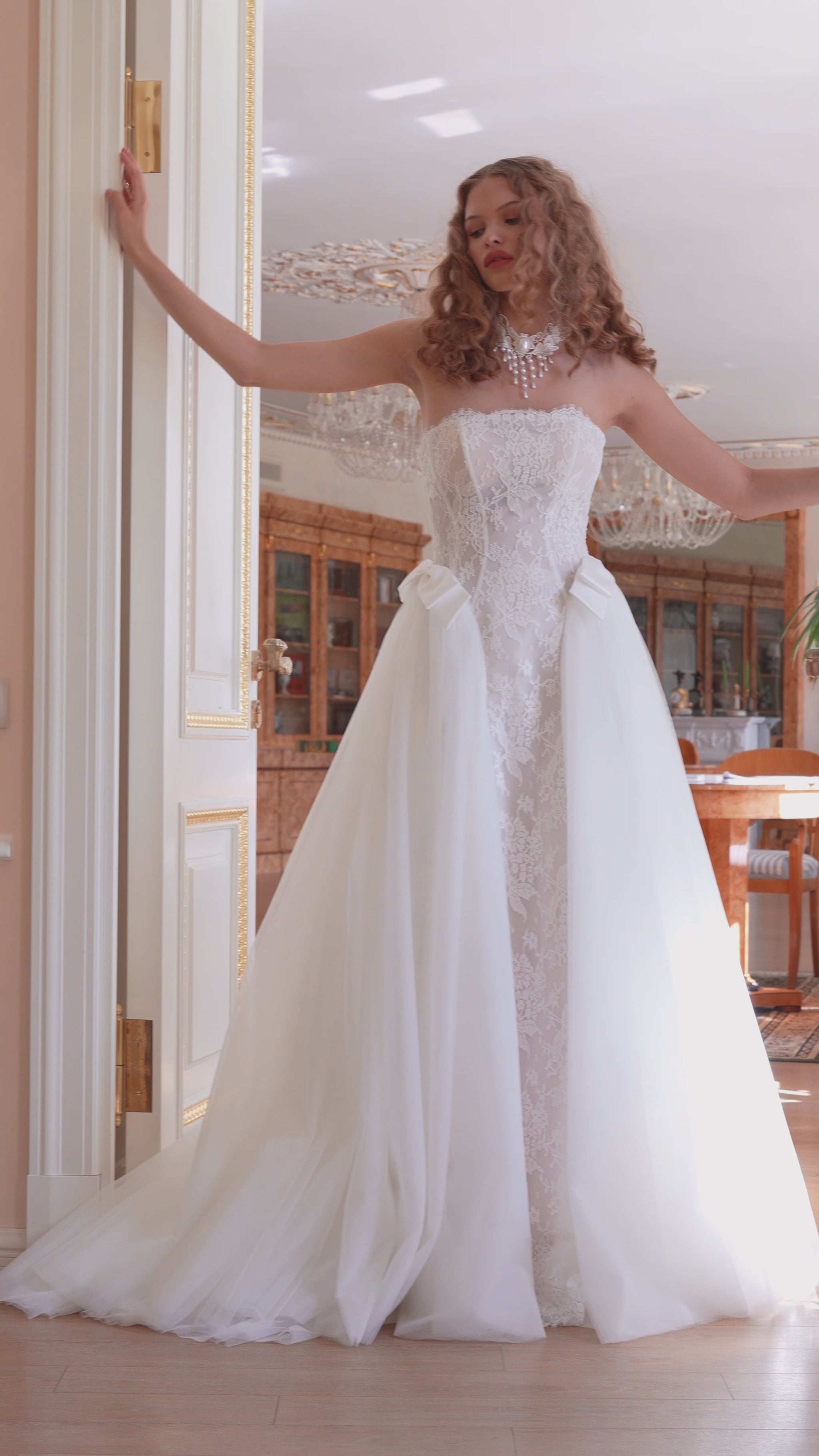 Two satin bows accent the waist, where layers of soft tulle cascade into a voluminous skirt that glides effortlessly with every step. The look blends sensuality and refinement — an ode to elegance in motion and the beauty of quiet luxury.