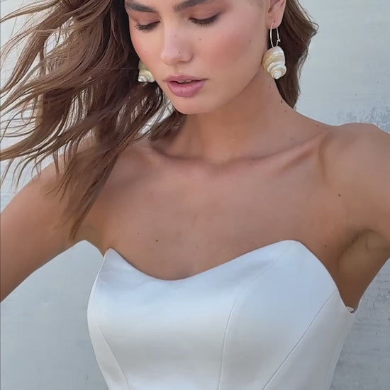 From the SKY Collection, this sculptural satin mermaid gown captures the essence of aerodynamic beauty. The clean, strapless neckline accentuates the shoulders and collarbones, while the structured side panels create a fluid architectural silhouette that hugs the body before flaring into a dramatic chapel train. Crafted in luminous satin, the gown evokes both strength and serenity — a statement of confidence for the modern bride who moves boldly, gracefully, and without limits.