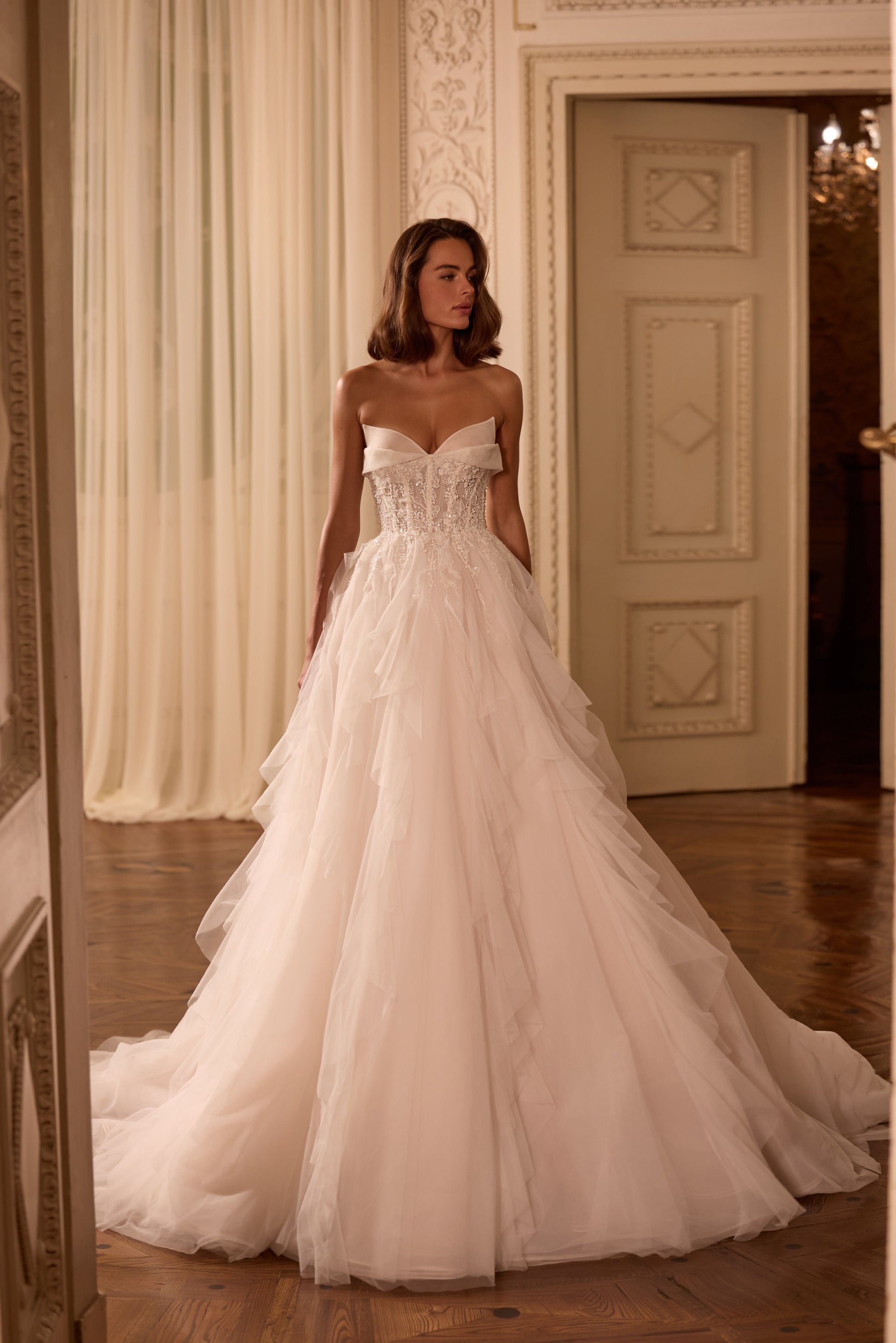 Strapless Tulle A-Line Wedding Dress with Beaded Corset Layered Skirt