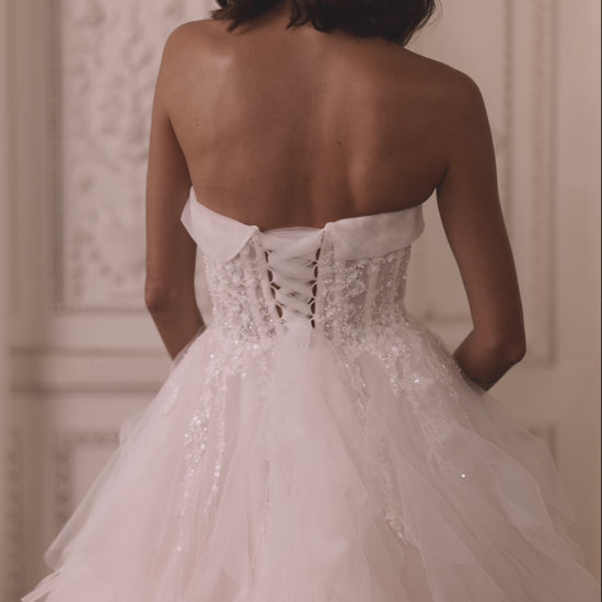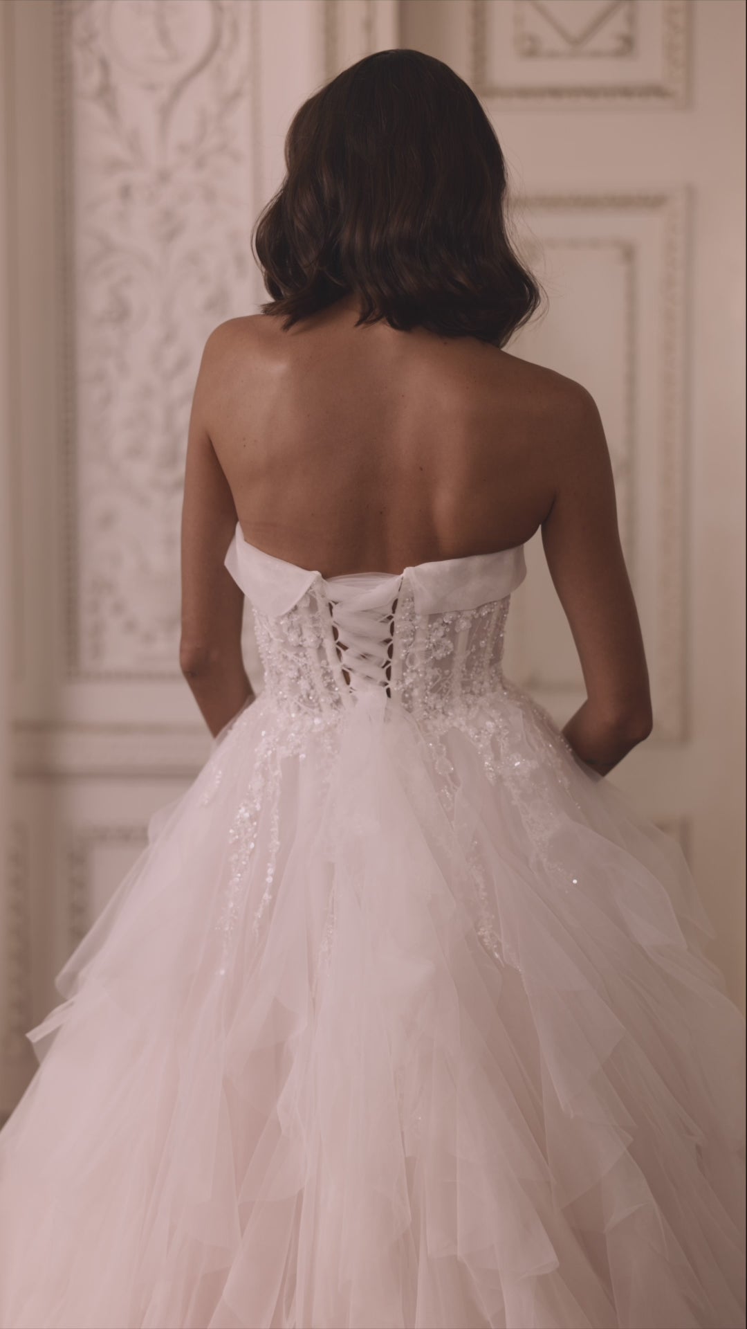 This breathtaking strapless A-line wedding gown features a sculpted bodice with a soft boned lace-up corset that gently shapes and shines, thanks to delicate beaded embroidery. The neckline is structured yet fluid, giving a refined edge to a deeply romantic silhouette.